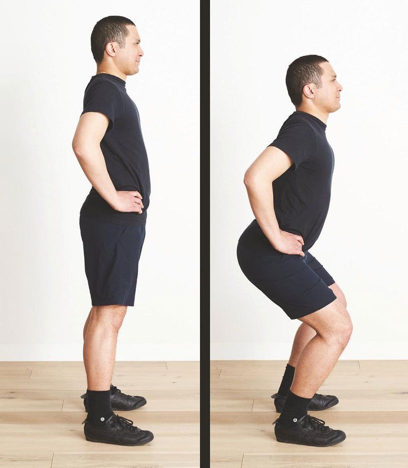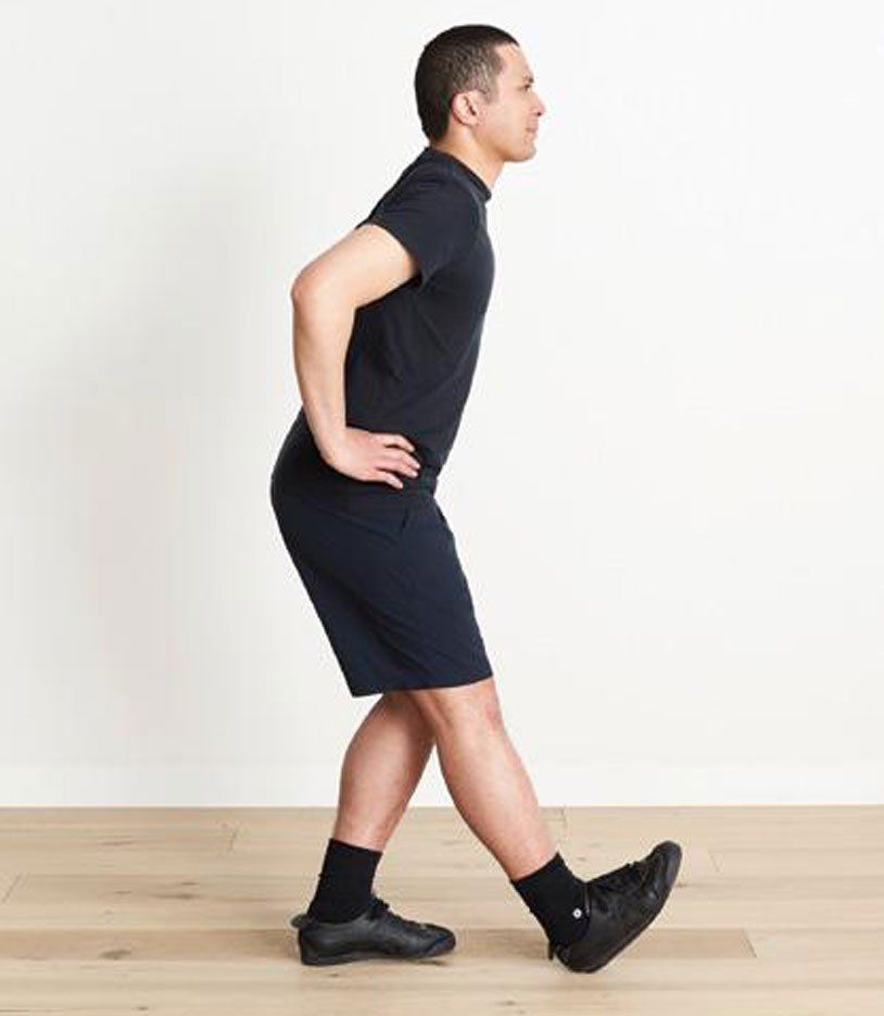 Position feet shoulder width apart with knees slightly bent and hands on hips.